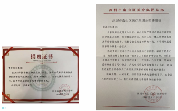 捐贈儀式上,南山區(qū)醫(yī)療集團總部副總院長張飛先生表示:感謝香港衍生集團為一線醫(yī)護工作者捐贈物資,這是香港衍生集團大愛的彰顯,這不僅溫暖了醫(yī)護人員的心,更激勵了我們抗擊疫情的斗志!