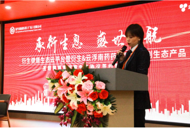 儀式上,衍生健康醫(yī)藥(廣東)有限公司市場(chǎng)部總監(jiān)覃珊女士做為項(xiàng)目對(duì)接人介紹了本次雙方合作簽約背景,她表示:“本次雙方的合作介于兩個(gè)最火的市場(chǎng)關(guān)鍵詞:一是健康;二是互聯(lián)網(wǎng)+時(shí)代。在過去的2020年一場(chǎng)疫情推動(dòng)了全世界人民對(duì)“健康”的意識(shí)!而 “全民健康-堅(jiān)持預(yù)防為主、倡導(dǎo)健康文明生活方式”更是列入了十九大會(huì)議“健康中國(guó)戰(zhàn)略”的一個(gè)重要方針!衍生集團(tuán)一直專注「婦兒,中醫(yī),中藥,醫(yī)療」版塊,致力于中醫(yī)文化傳承、中醫(yī)藥及“藥食同源”健康產(chǎn)品的科研、生產(chǎn)、市場(chǎng)銷售業(yè)務(wù),并以中醫(yī)文化“藥食同源“防范于未然 的健康調(diào)理系列產(chǎn)品收獲了社會(huì)各界及消費(fèi)者的認(rèn)可。同時(shí),衍生集團(tuán)于2018年投建、2020年投入使用、建筑面積達(dá)72680平方米的衍生健康醫(yī)藥產(chǎn)業(yè)園,正式落戶云浮,筑建中醫(yī)文化特色及“藥食同源”大健康產(chǎn)業(yè)產(chǎn)品供應(yīng)與服務(wù)鏈!